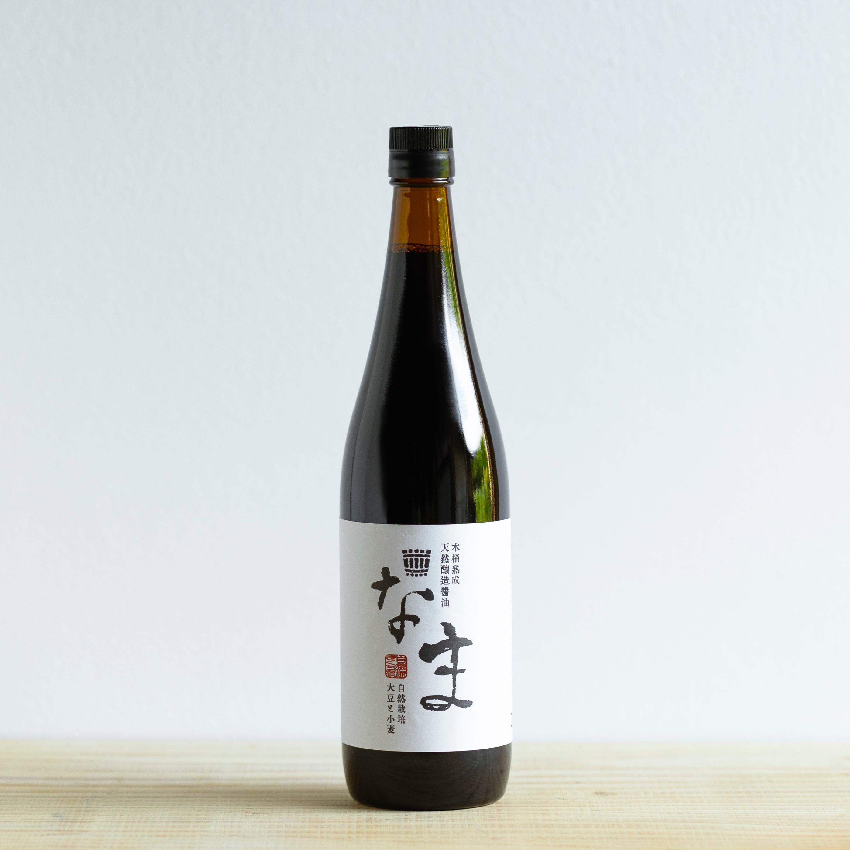 この「天然醸造醤油“なま”」は、熊本県菊池産の自然栽培で育てられた小麦と大豆を原材料に、 昔ながらの製法を守る香川県小豆島の正金醤油が、約100年近い歴史を誇る醤油蔵で醸し出す堂々たる風格の杉桶の中で熟成させた“なま” 醤油です。